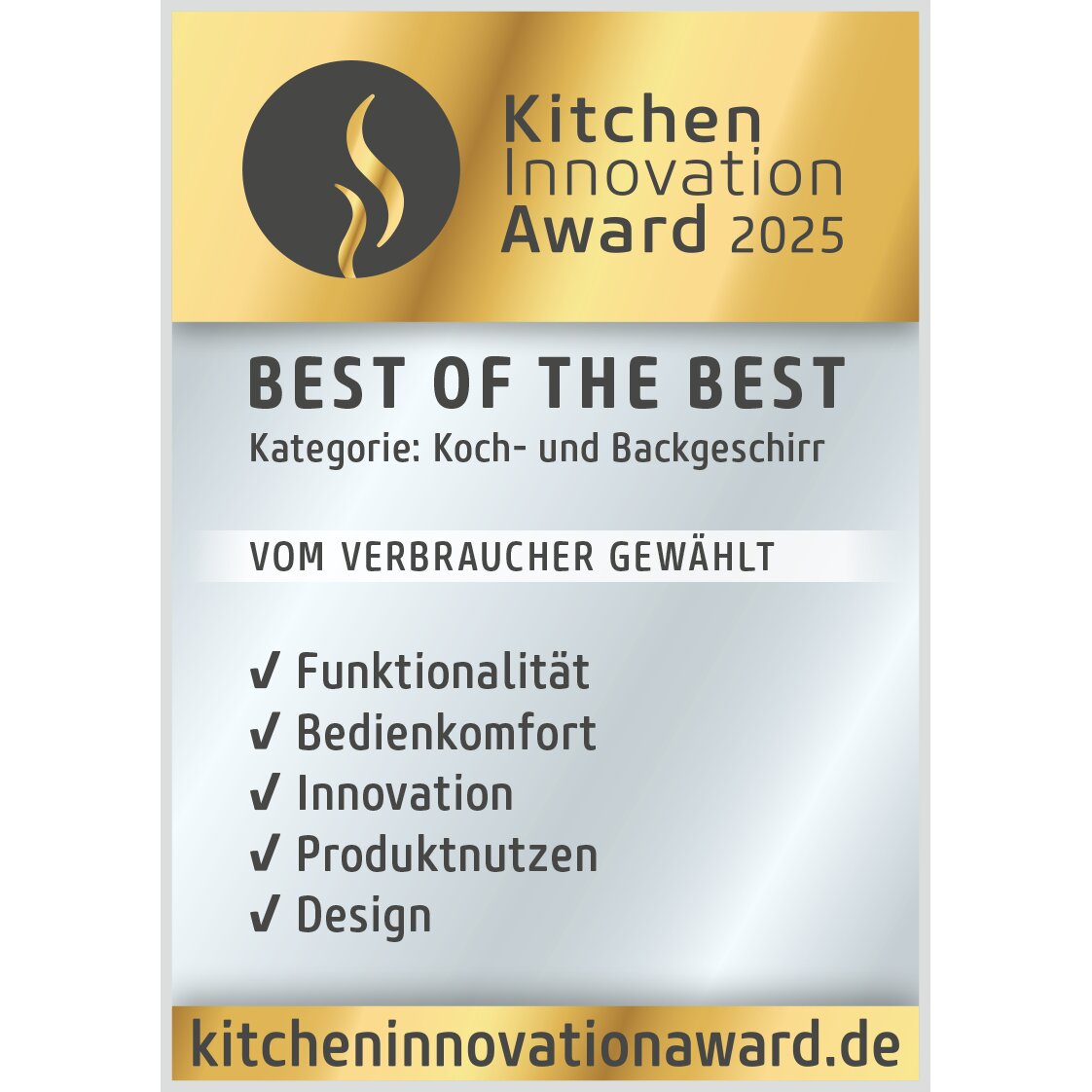 Die Deckel aus bruchsicherem Glas mit seitlichem Dampfauslass sind rutschfest und dichtschließend. Der patentierte Langgriff ist ergonomisch und mühelos mit einer Hand zu bedienen. Werden Pfanne oder Topf zu schwer, um sie mit einer Hand zu tragen, können Sie zusätzlich einen der Silikongriffe auf der gegenüberliegenden Seite des Langgriffs anbringen. Alternativ können Sie auch beide Silikongriffe verwenden. So können Sie Topf oder Pfanne mit zwei Händen transportieren.